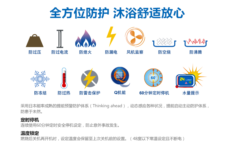 安全装置:熄火安全、防空烧安全、停电时安全、防过热、防过电流、防过压安全、风扇转速检测、防沸腾、防漏电安全、60分钟定时停机保护、防冻装置
