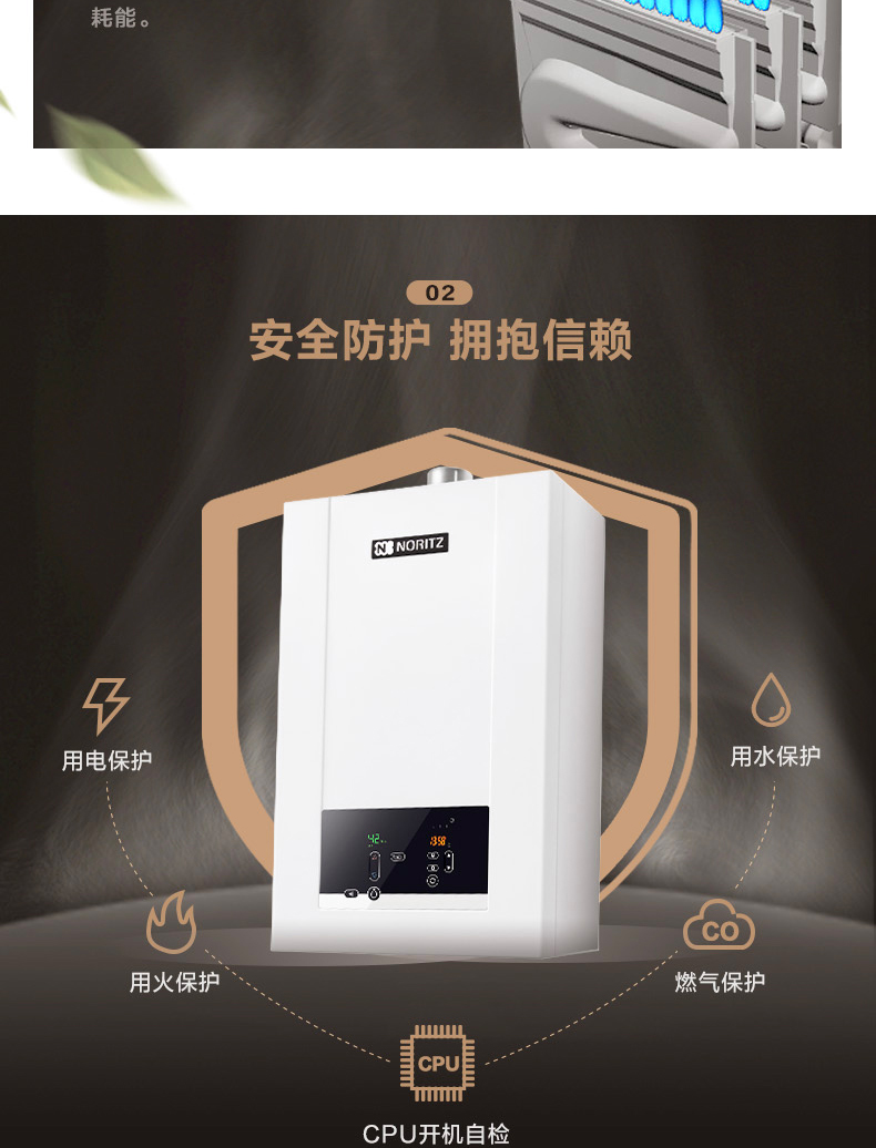 安全装置:熄火保护、过压保护、可复式空烧保护、水及气路过滤、熔断式过热保护、LED数码故障显示、断水保护、防雷击保护、双重燃气电磁阀等安全保护装置