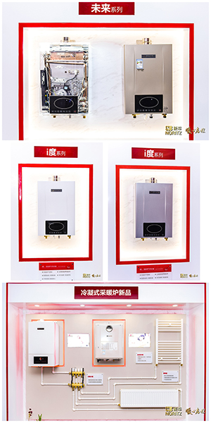 此次发布会能率介绍了即将上市的新品,包括(新一代未来系列智能燃气热水器 、新一代i度系列智能燃气热水器 、即暖系列日本原装进口冷凝式采暖炉 、轻暖系列冷凝式采暖热水两用炉 、家庭全屋净水系统 )。